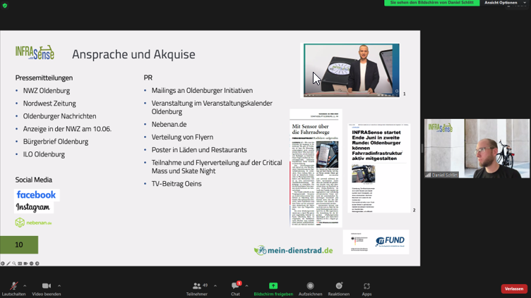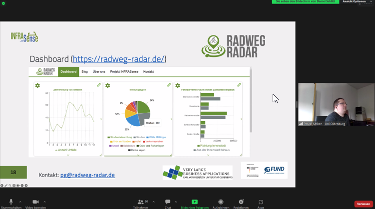 Am 16.06.2023 veranstaltete die mFUND-Begleitforschung MoveMobility einen Online-Fachaustausch [2] zum Thema ‚Erfahrungen, Bedarfe und Daten – Mit Bürger:innenbeteiligung die Zukunft der Mobilität gemeinsam gestalten. Mit dabei waren Daniel Schlitt, Pascal Säfken und Johannes Schering um dort von unseren Erfahrungen aus INFRASense zu berichten und standen ebenfalls in der anschließenden Diskussion Rede und Antwort. Neben INFRASense stellten zudem mit ESSEM und start2park zwei weitere mFUND-Projekte ihre Vorgehensweisen und Erkenntnisse zur Büger:innenbeteiligung vor.