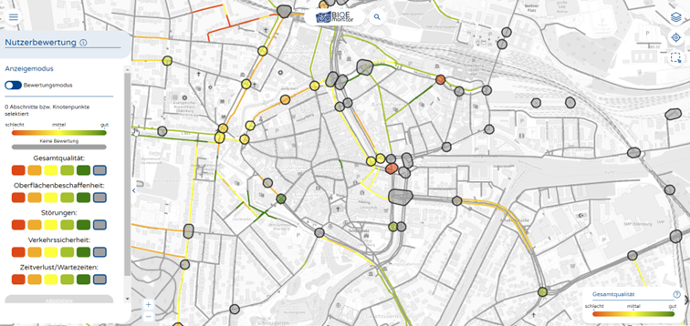 Zum anderen wird die Erfassung der Fahrraddaten mit Hilfe der Sensorik um eine subjektive Komponente durch Nutzerbewertungen ergänzt. Bürger:innen haben auf der Web-App BIQEmonitor die Möglichkeit einzelne Strecken auszuwählen und anhand verschiedener Kriterien zu bewerten.