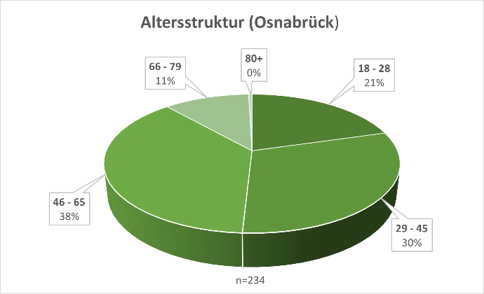 Bei der Auswahl der Teilnehmenden wurde versucht, den Bevölkerungsdurchschnitt zu repräsentieren und Teilnehmende aus allen Stadtgebieten zu berücksichtigen. Die Angaben zu den PLZ-Gebieten der Teilnehmenden lässt sich Abbildung 1 entnehmen. In Bezug auf die Angaben zum Geschlecht der Teilnehmenden, ordnen sich 51% dem weiblichen und 49% dem männlichen Geschlecht zu (vgl. Abbildung 2). Hinsichtlich der Altersstruktur der Teilnehmenden, entfällt der größte Anteil (38%) auf die Altersgruppe der 46-65-jährigen. Danach folgt die Altersgruppe 29-45 mit 30%. 21% der Teilnehmenden gehören der Altersgruppe der 18-28-jährigen an und 11% entfallen auf 66-79-jährige Personen, vgl. Abbildung 2. Die Altersverteilung in der Stadt Osnabrück wird präzise abgebildet, wobei die Altersgruppen der 18- bis 25-Jährigen sowie der 45- bis 65-Jährigen leicht überrepräsentiert sind und die Altersgruppe 80+ auf Grund mangelnder Registrierungen nicht repräsentiert werden konnte.