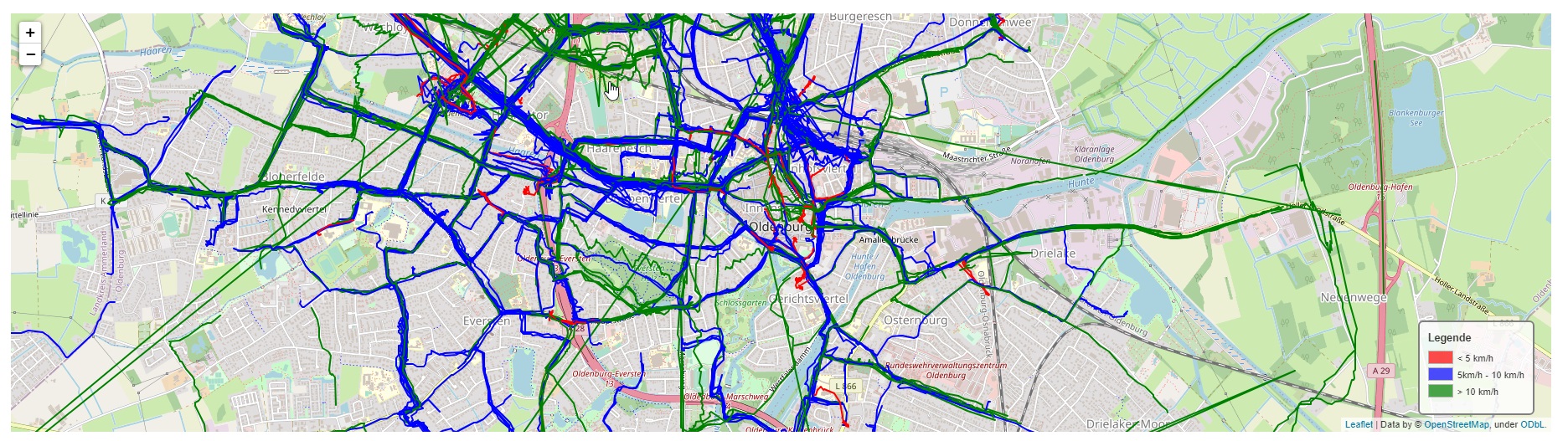 Die Karte zeigt die gefahrenen Strecken innerhalb des Stadtgebiets. Die Strecken sind je nach Durchschnittsgeschwindigkeit in verschiedenen Farben dargestellt. Die Durchschnittsgeschwindigkeit beinhaltet Bremsungen und Wartezeiten.