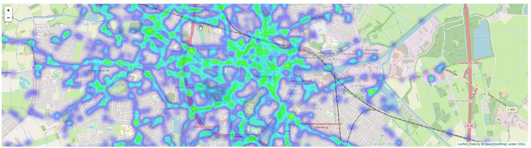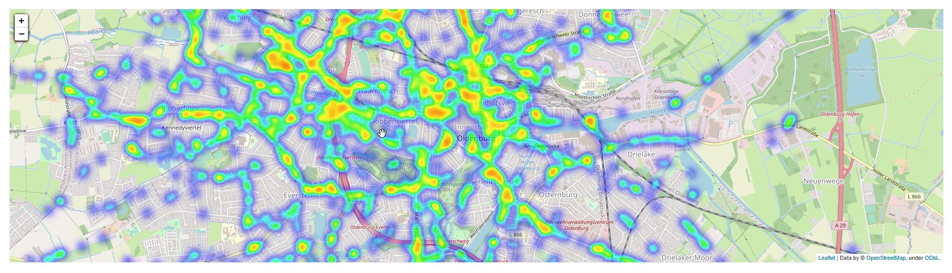 Die Karte zeigt die Anzahl der Erschütterungen als Heatmap. Das bedeutet, je mehr Erschütterungen an einer Stelle aufgezeichnet wurden, desto rötlicher ist die Darstellung auf der Karte. Die Erschütterungen können beispielsweise aufgrund von Bordsteinkanten, Beschädigungen oder Wechsel Straßenbelags entstanden sein.