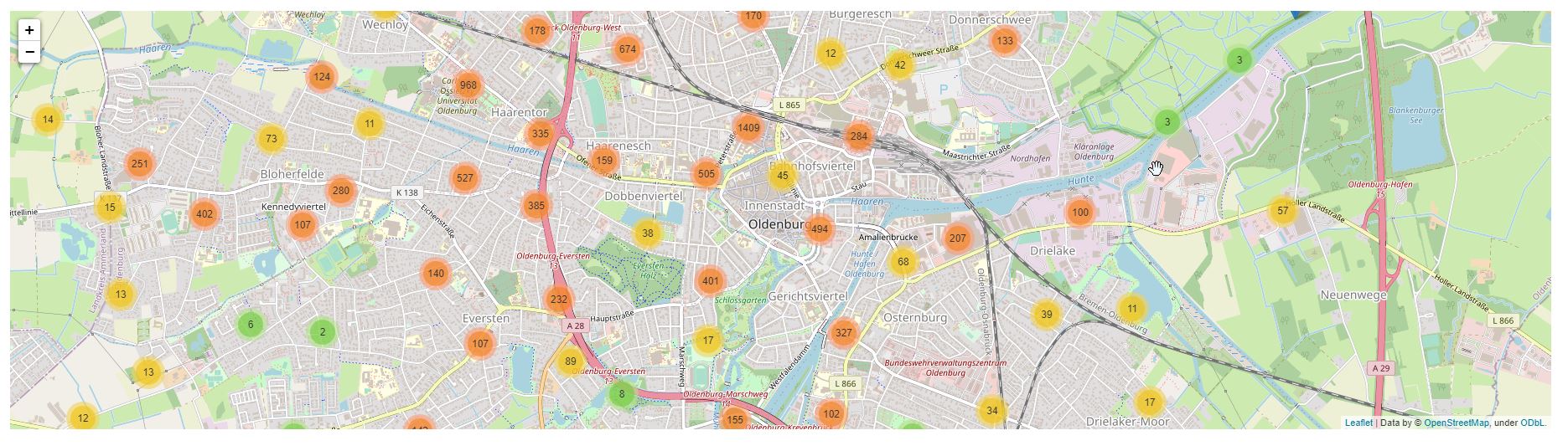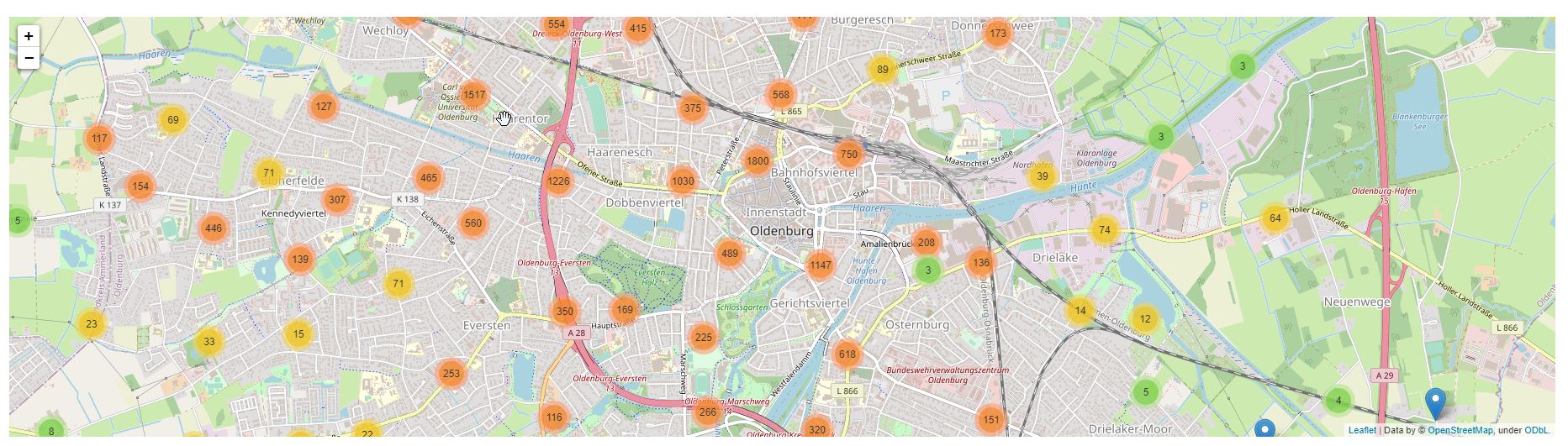 Die Karte zeigt die Anzahl der Erschütterungen an bestimmten Stellen im Stadtgebiet. Die Erschütterungen können beispielsweise aufgrund von Bordsteinkanten, Beschädigungen oder Wechsel Straßenbelags entstanden sein.